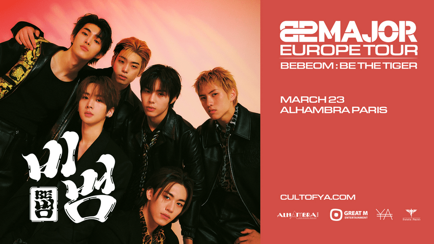 Les membres de 82MAJOR, Seong-il, Ye-chan, Seong-mo, Seong-bin, Seok-joon, et Do-gyun seront en concert à Paris le 23 mars 2026 pour leur tournée BEBEOM : BE THE TIGER.